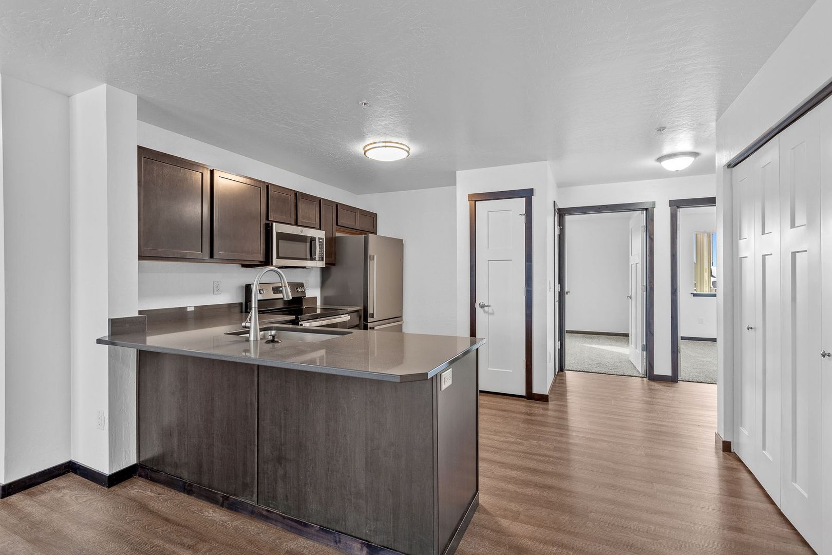 This 3 bed, 2 bath apartment comes with stainless steel appliances, including refrigerator, range/over, built-in microwave, dishwasher, and full size washer/dryer. Open floor plan with LVP flooring in living areas and carpet in bedrooms, soft close cabinets, quartz countertops throughout and private balcony and one car garage.